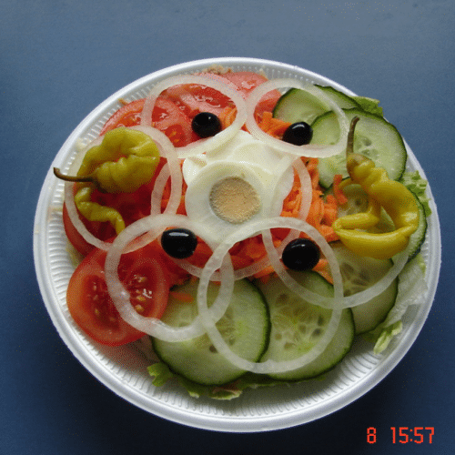 mit Eisbergsalat, Gurken, Tomaten, frischer Paprika, scharfen Peperoni, Oliven, Schafskäse und Zwiebeln